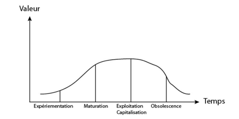 Le cycle de vie de la connaissance peut être représenté entre l’axe de la valeur et son évolution dans le temps.